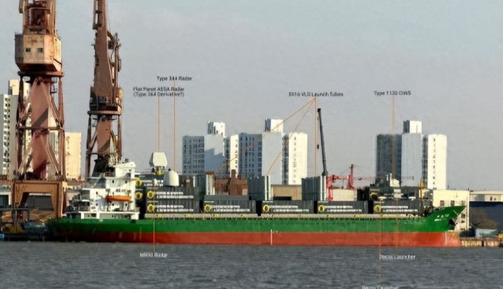 照片里,一艘看似普通的中国货轮甲板上,整齐布置着近60单元导弹垂直发射系统,船首还配备了1130型近防炮和多种军用雷达设备,火力规模直逼美军阿利·伯克级驱逐舰。